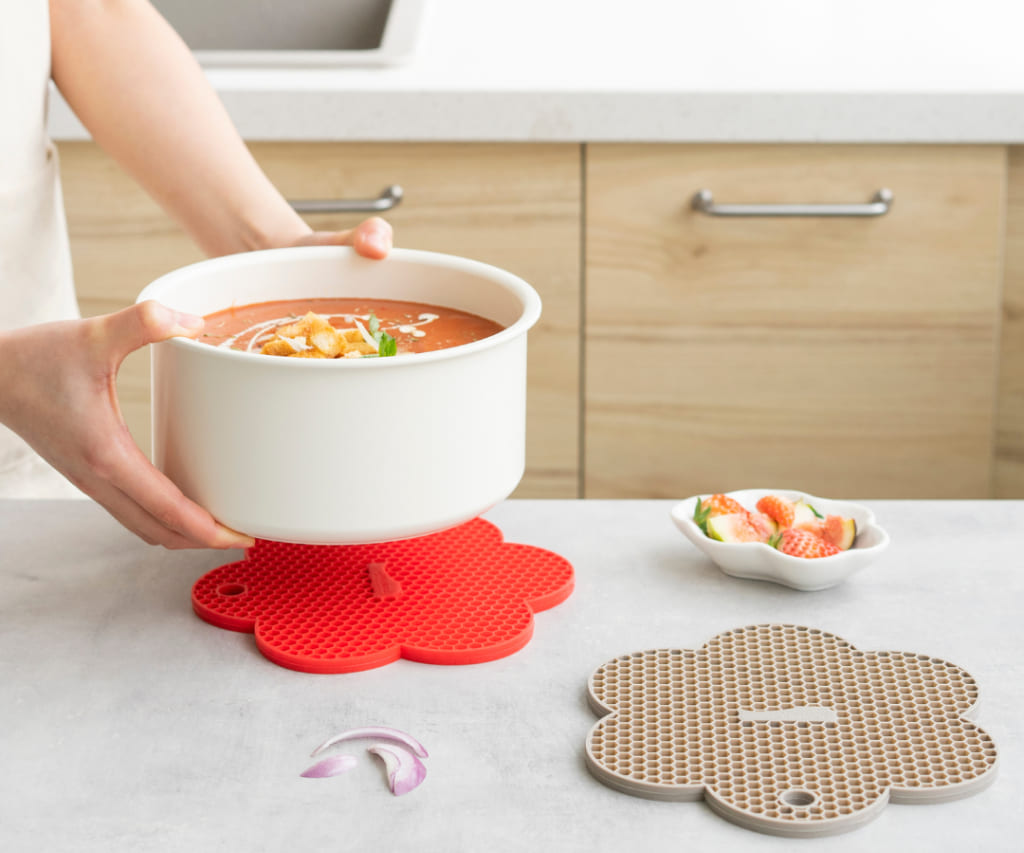 Ce couvercle breveté en silicone utilise une valve centrale en forme de fleur pour empêcher l’eau des pâtes ou du riz de déborder tout en permettant une cuisson vapeur saine.